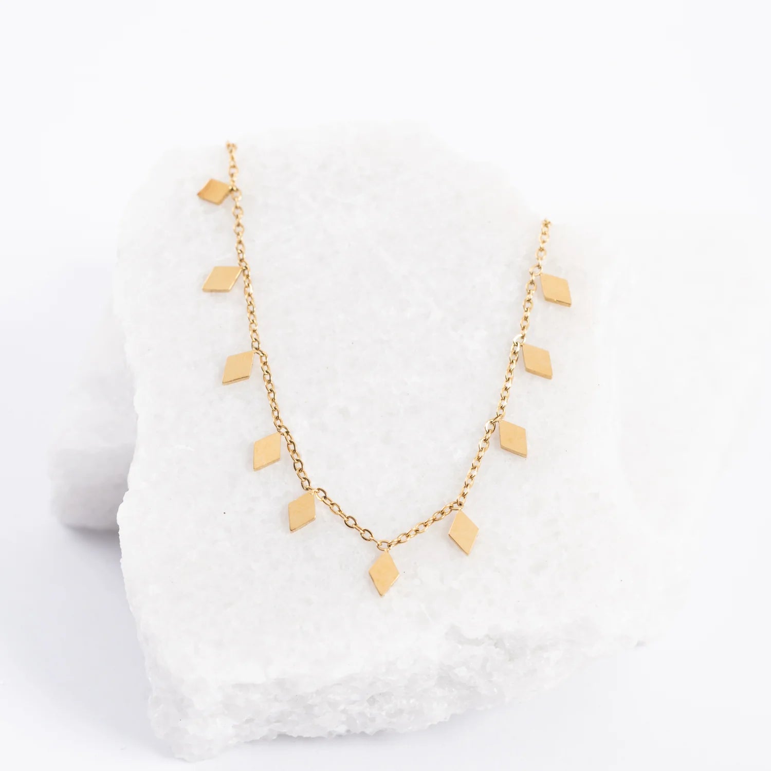 A soft shimmer that speaks volumes. Our Diamond Shape Charm Necklace features a delicate chain adorned with petite, 14K gold plated diamond-shaped charms—subtle yet striking. It’s the perfect piece to wear alone or layered with your everyday favorites.